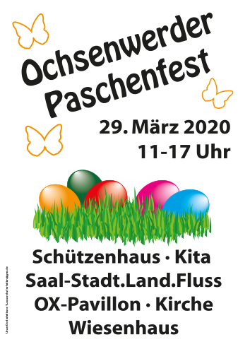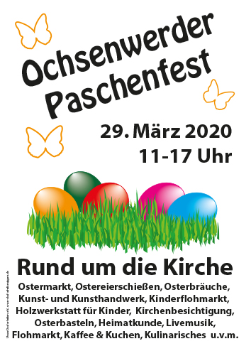 02.02.2015 | Ochsenwerder Paschenfest Auch in diesem Jahr noch einmal!!! Für Sonntag, den 22.03.2015, von 11.00 bis 17.00 Uhr, sind zahlreiche Aktivitäten im idyllischen Dorfkern Ochsenwerders an verschiedenen Orten geplant. Neben dem Verein „Unser Dorf erhalten e.V.“ beteiligen sich die Kita Ochsenwerder, die Kirchengemeinde Ochsenwerder und die Ochsenwerder Schützengemeinschaft am „Ochsenwerder Paschenfest“. Eine Mischung aus Kunst, Kunsthandwerk, Kultur und Kurzweil bietet für jeden Geschmack etwas. Die Veranstaltungsorte sind durch einen Rundweg erschlossen.